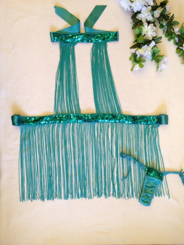 Изумрудная сорочка из тонких веревочек впечатляет своей откровенностью и сексуальностью. Особый блеск придают пайетки. Фиксирсируется сорочка лентами на спине и шее.