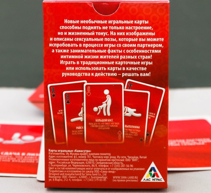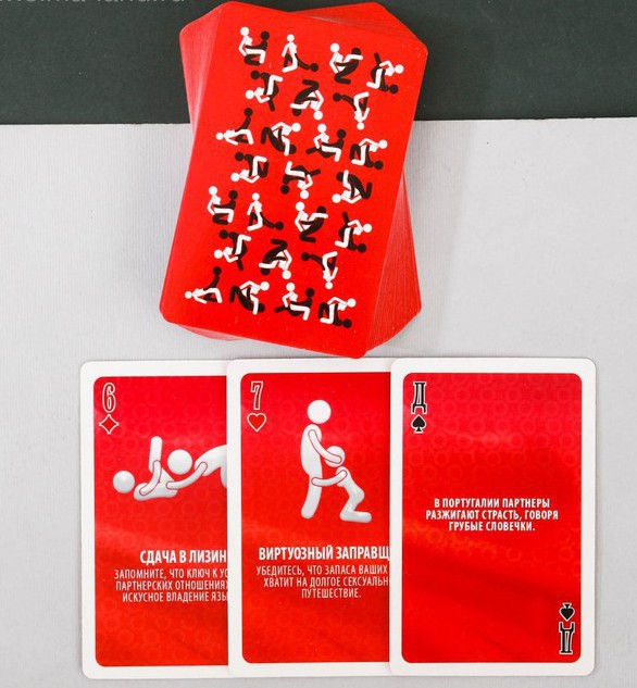 Новые необычные игральные карты способны поднять не только настоение, но и жизненный тонус. На них изображены и описаны сексуальные позы, которые Вы можете использовать в процессе игры со своим партнером, а так же занимательные факты с особенностями интимной жизни жителей разных стран!