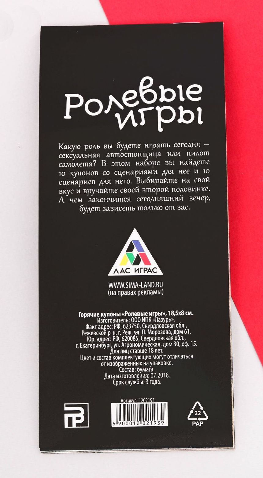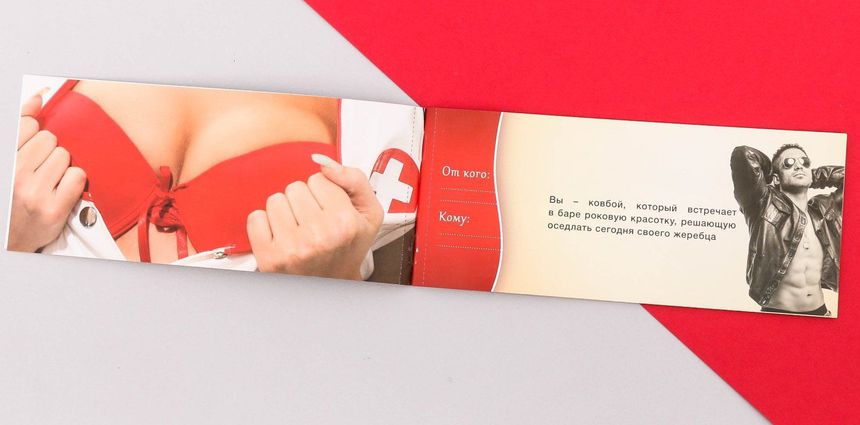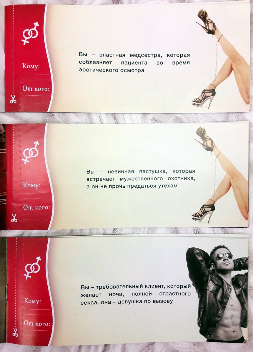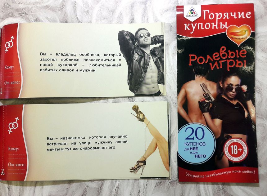 Внутри вы найдёте купоны со страстными сценариями для неё и для него. Выбирайте любой понравившийся план событий и дарите друг другу страстное наслаждение!