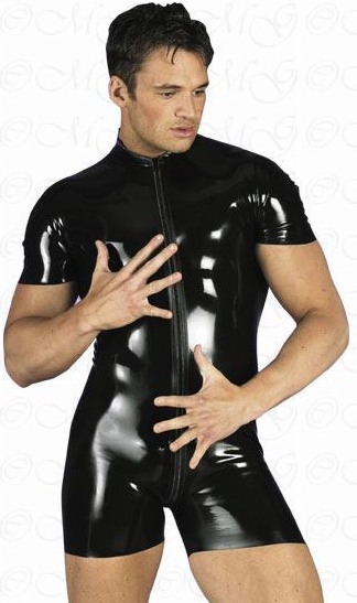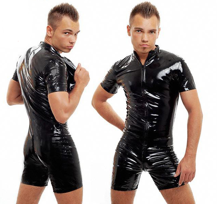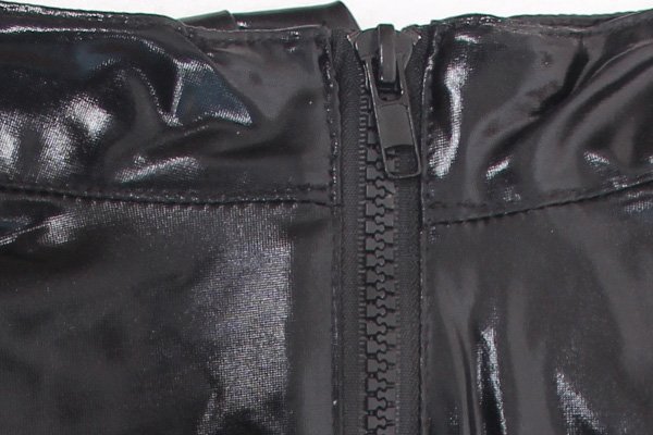Облегающий комбинезон из ткани, имитирующей винил. Комбинезон застегивается длинной молнией до промежности (один бегунок).