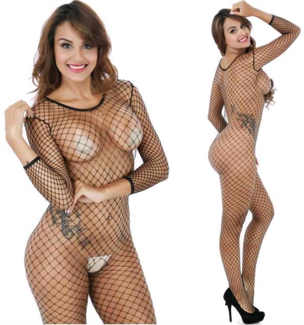 Комбинезон в крупную сетку с длинным рукавом и разрезом в интимной части.