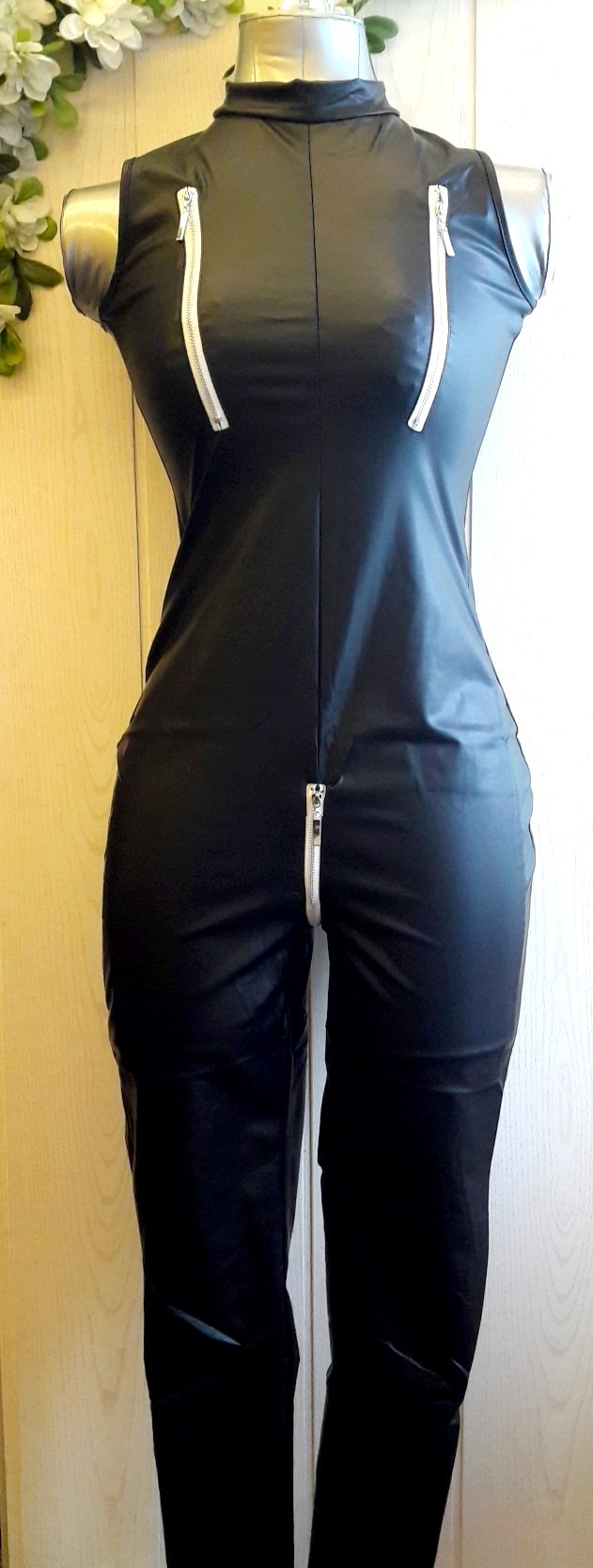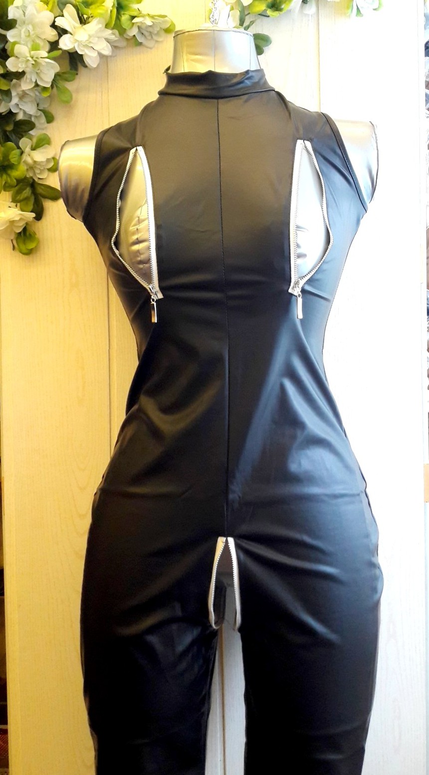 Особенность комбинезона: молнии на интимных местах. Благодаря матовому полиэстеру, владелица данного комбинезона будет чувствовать себя наиболее соблазнительной.