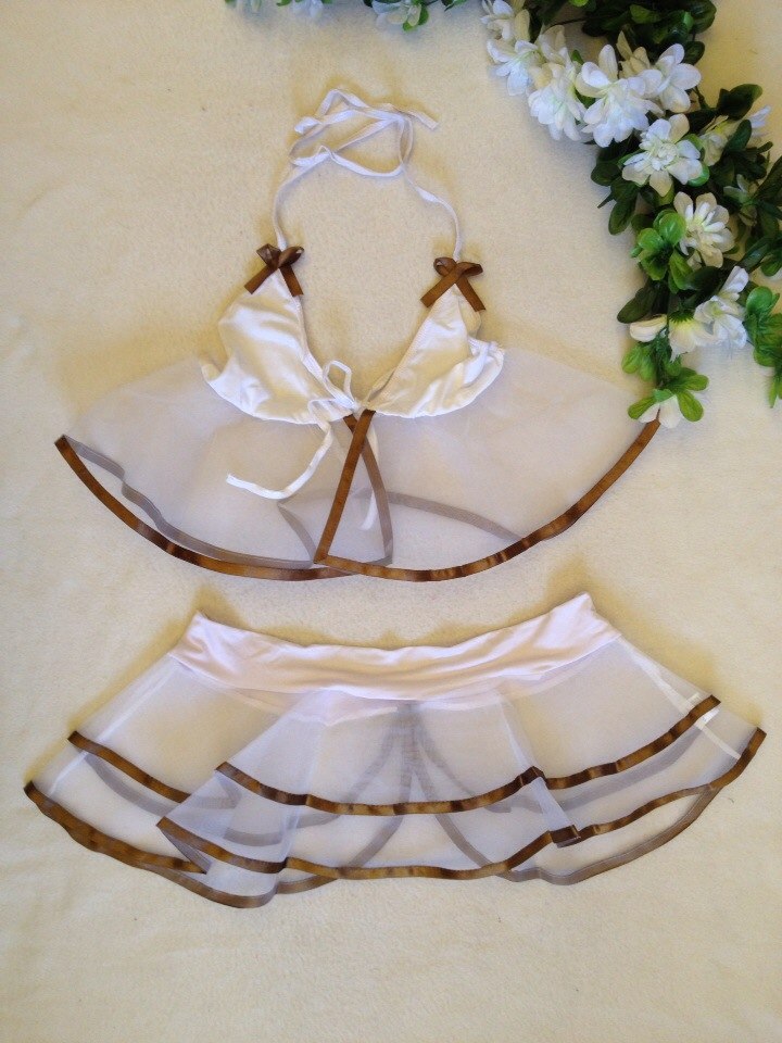 Комплект состоит из топа и юбочки, декорированных прозрачными рюшами.