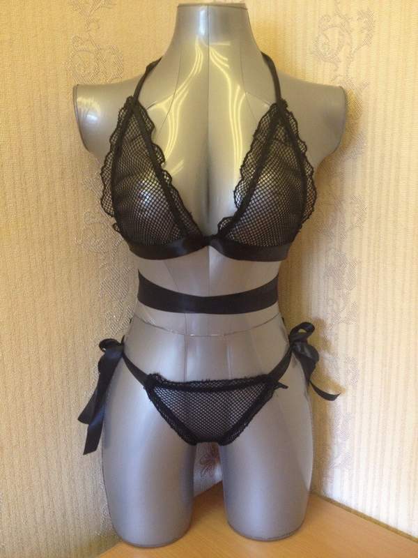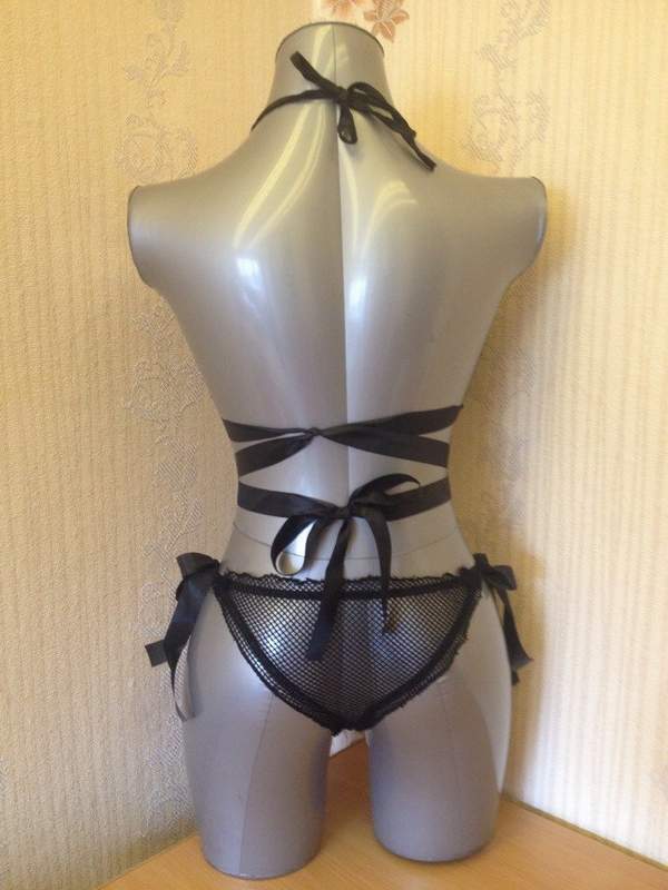 Соблазняющий комплект, состоящий из лифа, завязывающегося длинными атласными лентами вокруг тела, и трусиков, регулирующихся по размеру завязками на боках.