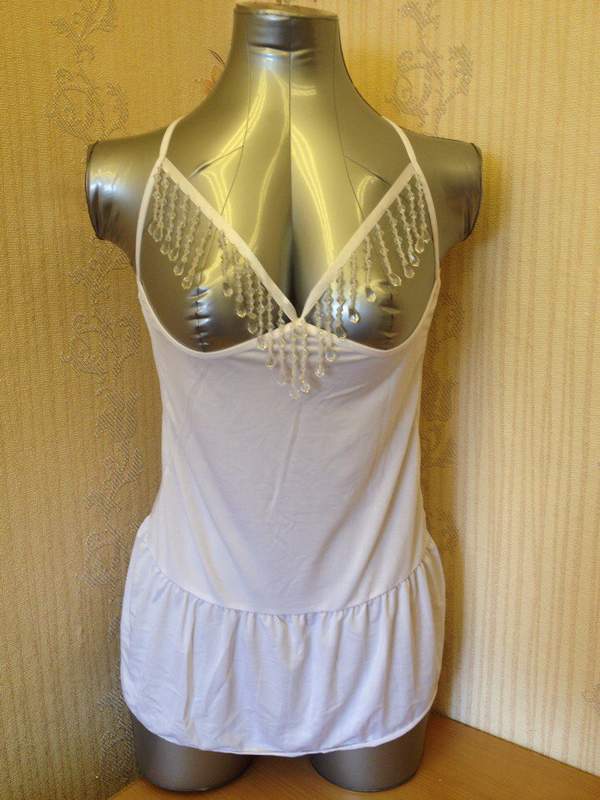 В комплекте сексуальная мини-сорочка открытой грудью и трусики-стринги.