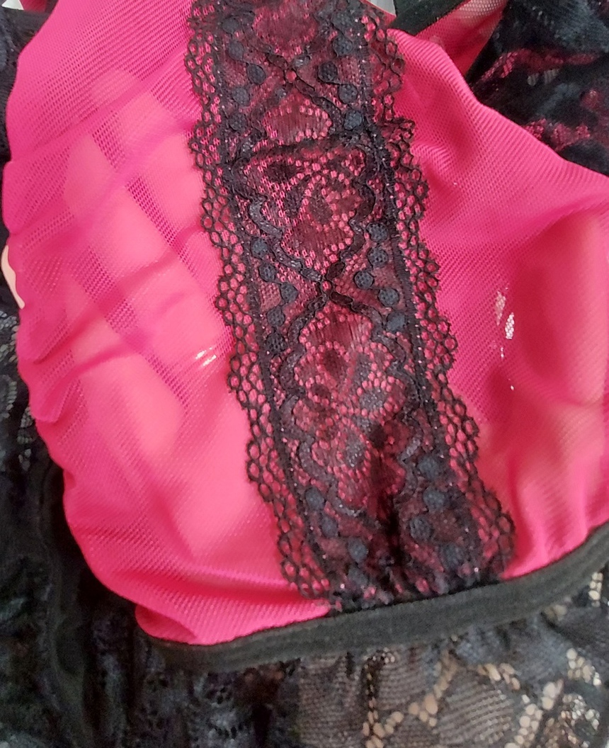Комплект выполнен из полупрозрачной микросетки, украшенной черным кружевом.