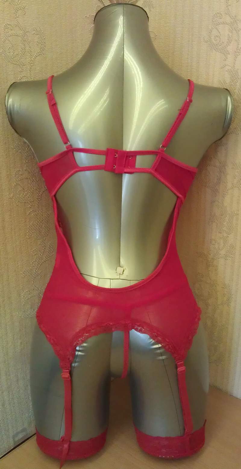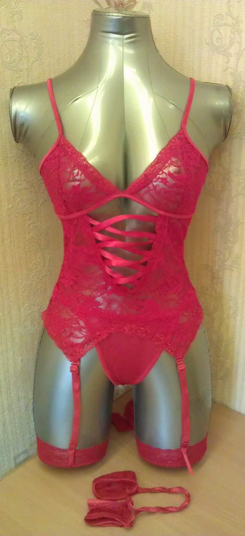 Красный комплект из мягкого кружева с подвязками для чулок.