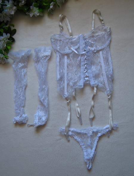 Сексуальный ажурный комплект с пластиковыми ребражи жесткости и лифом на косточках. Впереди шнуровка. Лямки и подвязки регулируются по длине. Подвязки для чулок съемные. Перчатки с петелькой для пальца.