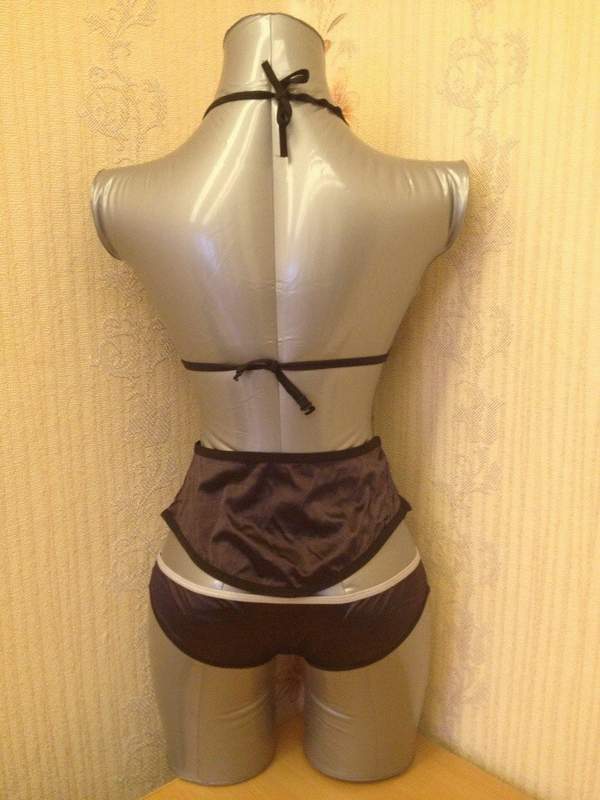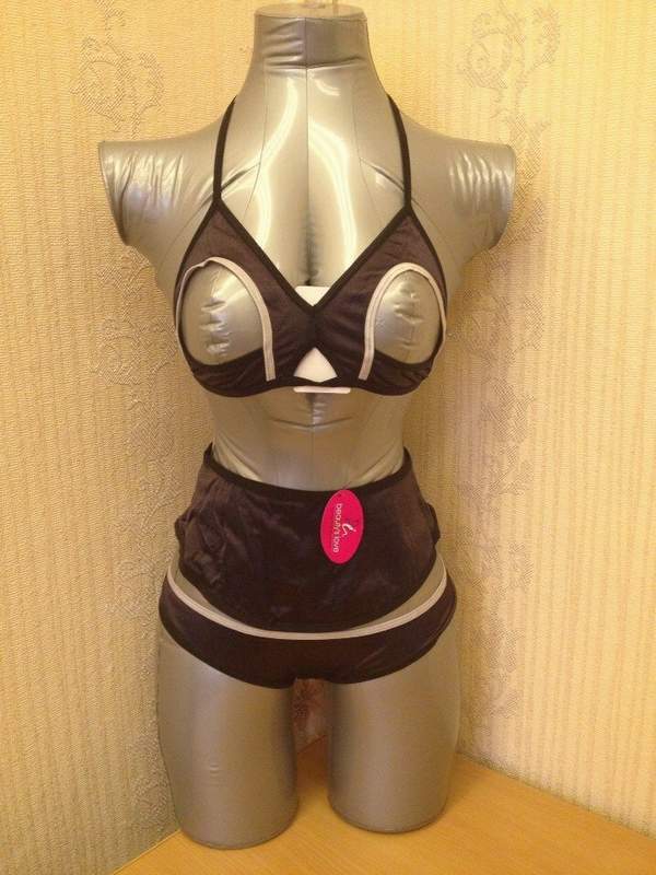 Откроенный комплект с открытой грудью на застежке сзади и на регулируемых бретелях, трусики и широкий эластичный пояс, подчеркивающий тонкую талию.