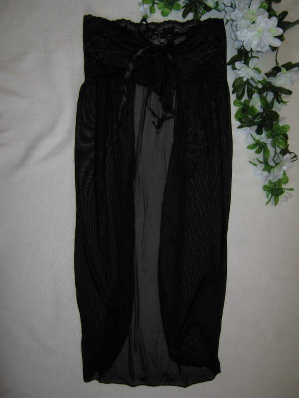 Сексуальный полупрозрачный комплект состоит из топа на тонких бретельках и трусиков, переходящих в юбочку.