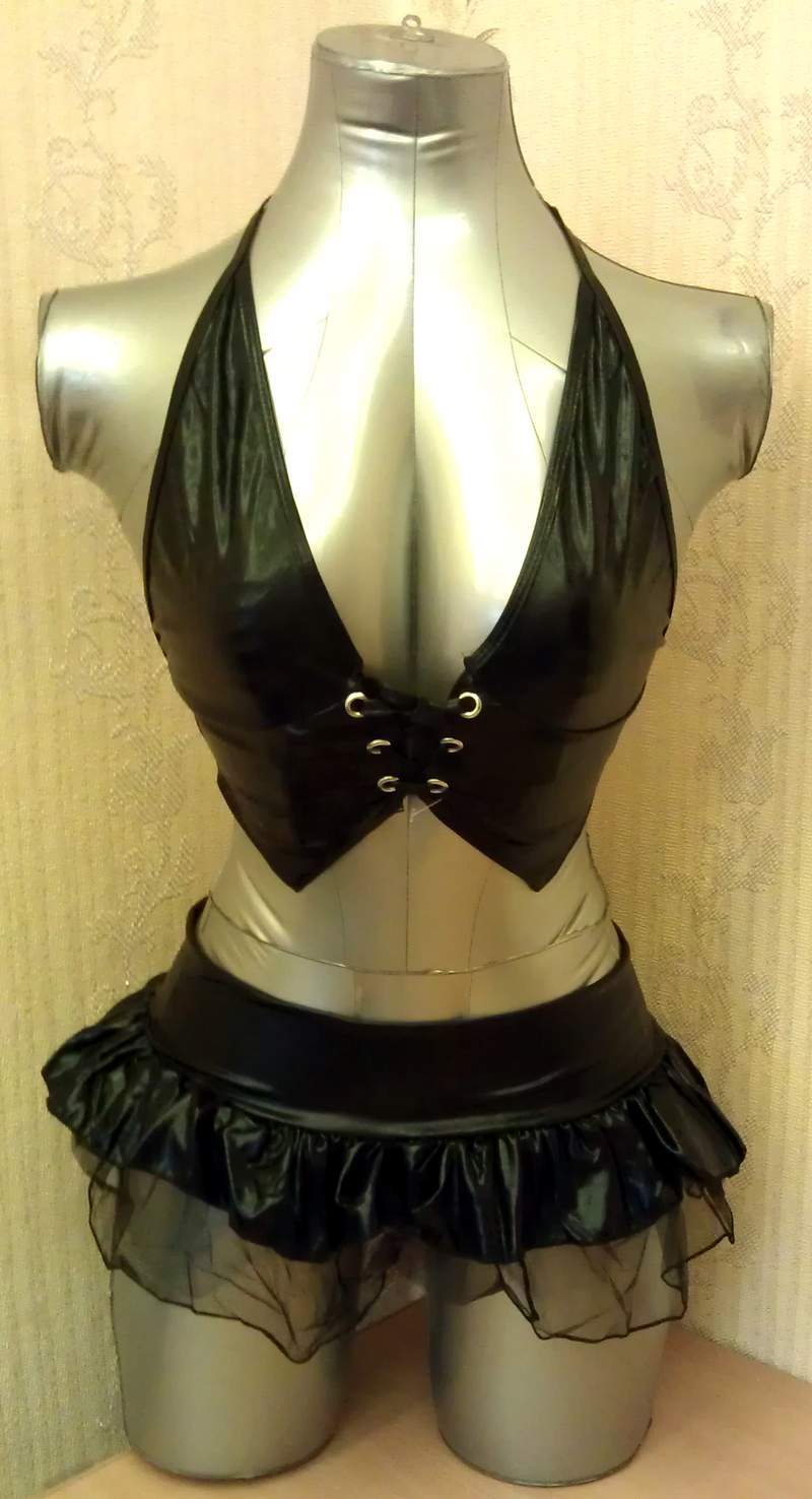 Сексуальный комплект, состоящий из топа с большим вырезом, завязывающегося на декоративный шнурок и привлекающий максимальное внимание к груди, и юбочки с нежнейшим подъюбником, который придает объем и превращает обладательницу в страстную натуру.