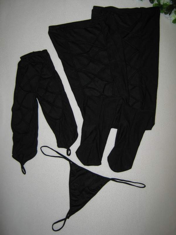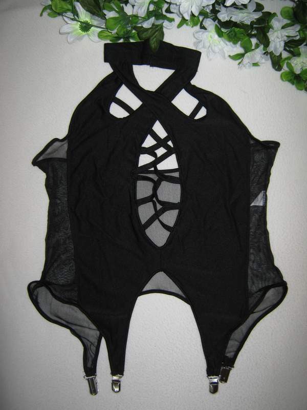 Эротический комплект выполнен из эластичного материала. Топ с открытой спинкой и воротничком заканчивается подтяжками.