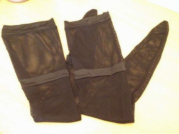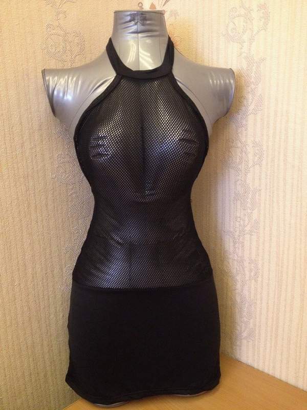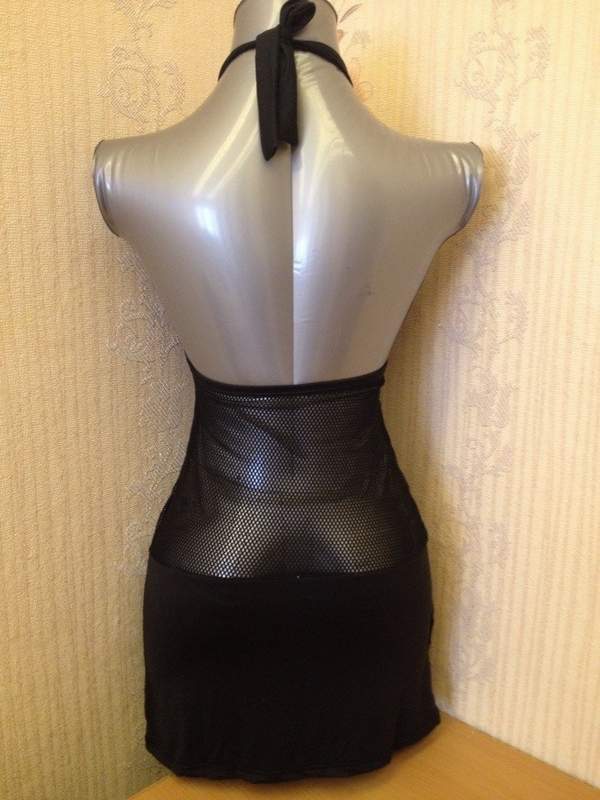 Эротический комплект включет откровенную сетчатую сорочку с несъемными подвязками и чулки.