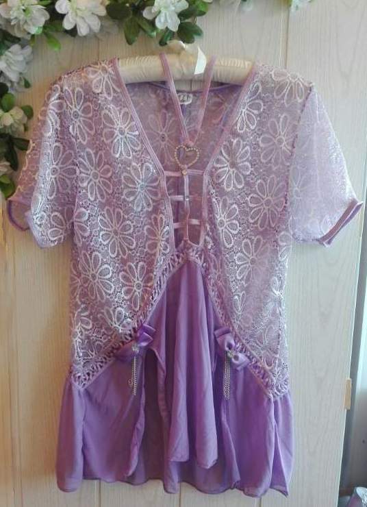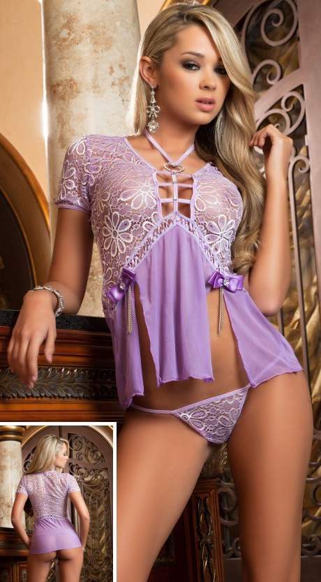 Притягательный сиреневый комплект, состоящий из сорочки и трусиков.