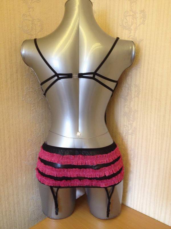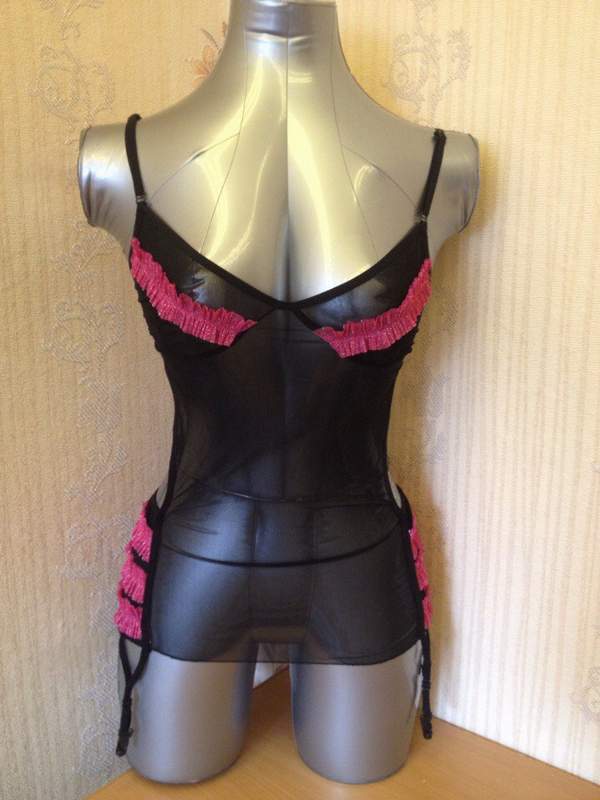 Изящная полупрозрачная сорочка с открытой спиной и юбочкой, украшена яркими рюшами.