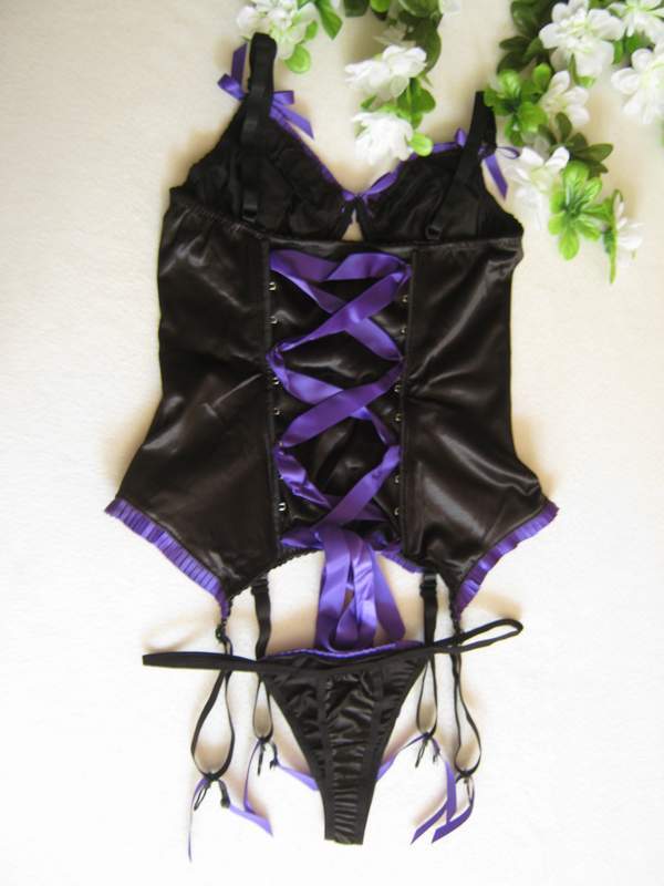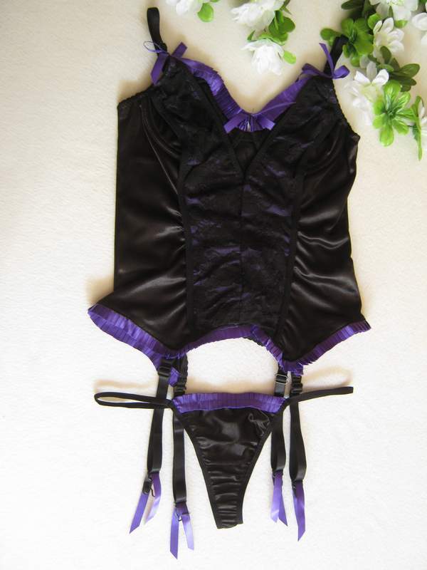 Атласный эластичный комплект, украшенный фиолетовыми рюшами и кружевом.