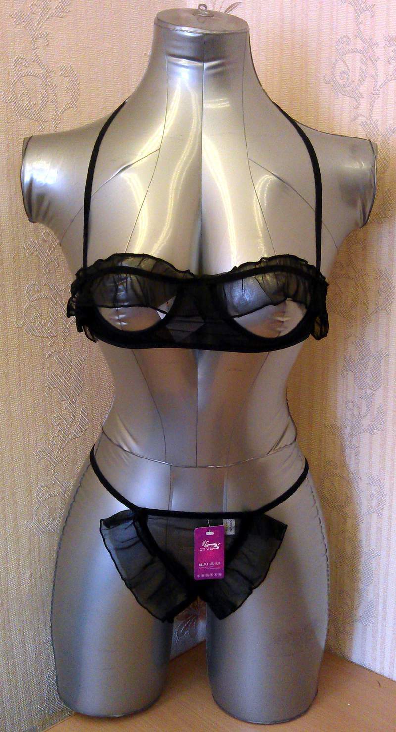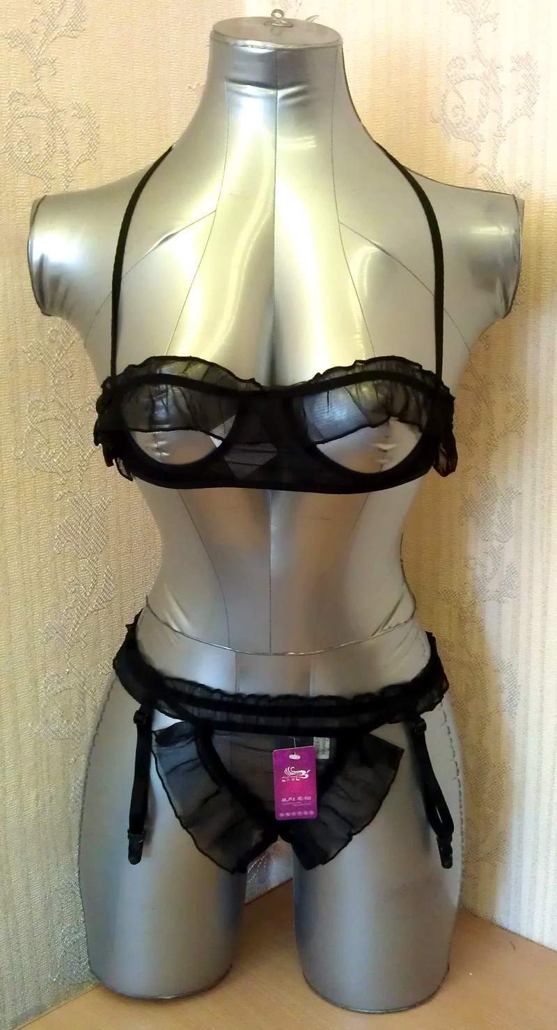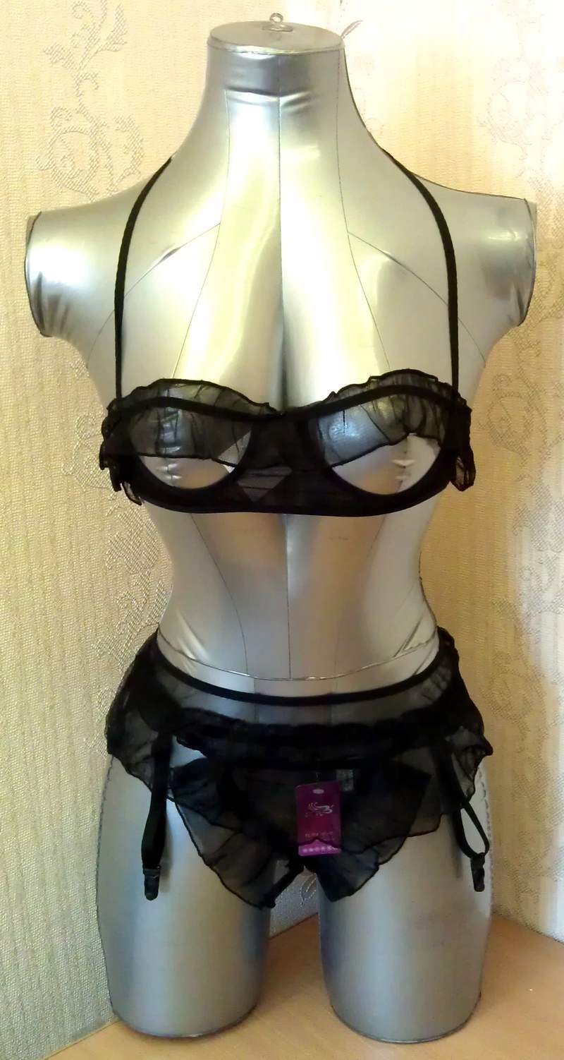 Полупрозрачный комплект с открытой грудью продемонстрирует ваше тело. Комплект украшен рюшами.
