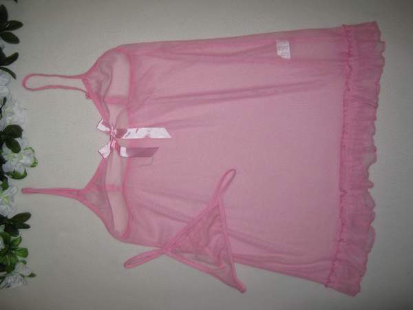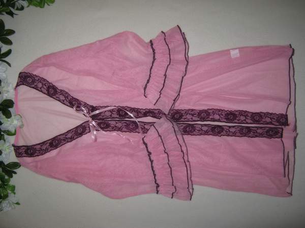 Очаровательный розовый комплект, украшенный пурпурной каймой. Пенюьар насборен на спинке, сорочка украшена рюшами.