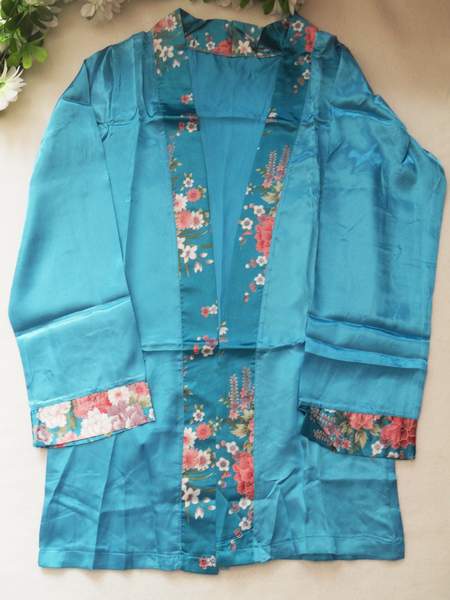 Комплект из халатика и короткой сорочки небесно-голубого цвета с цветочной отделкой.