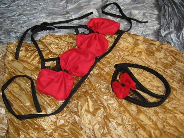 В комплекте лиф и С-стринг, украшенные яркими красными бантами