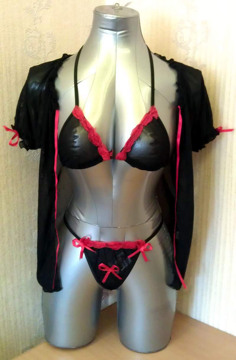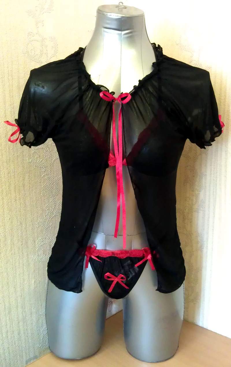 Комплект из бюстгальтера, трусиков и короткого пеньюара, декорированных красными розочками и бантиками. Пеньюар по горловине насборен на резинку. Рукава-фанарики. Бюстгальтер завязывается на шее и спине (без поролона и без косточек)