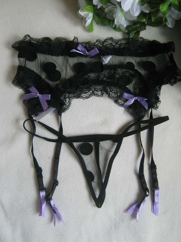 Комплект включает трусики и пояс с подвязками для чулок. Пояс в мелкую сеточку декорирован кружевом и атласными бантиками фиолетового цвета.