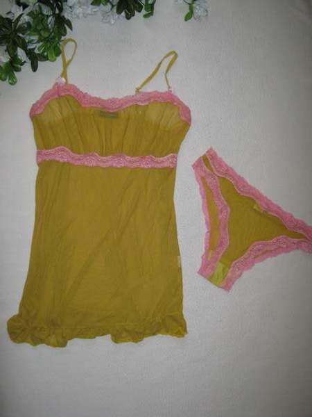 Симпатичный топик горчичного цвета в комплекте с трусиками-слип. По краю комплект украшен розовым кружевом