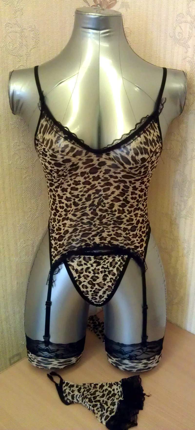 Сексуальный леопардовый комплект из топа с подвязками для чулок, трусиков, перчаток с кружевом и чулок.