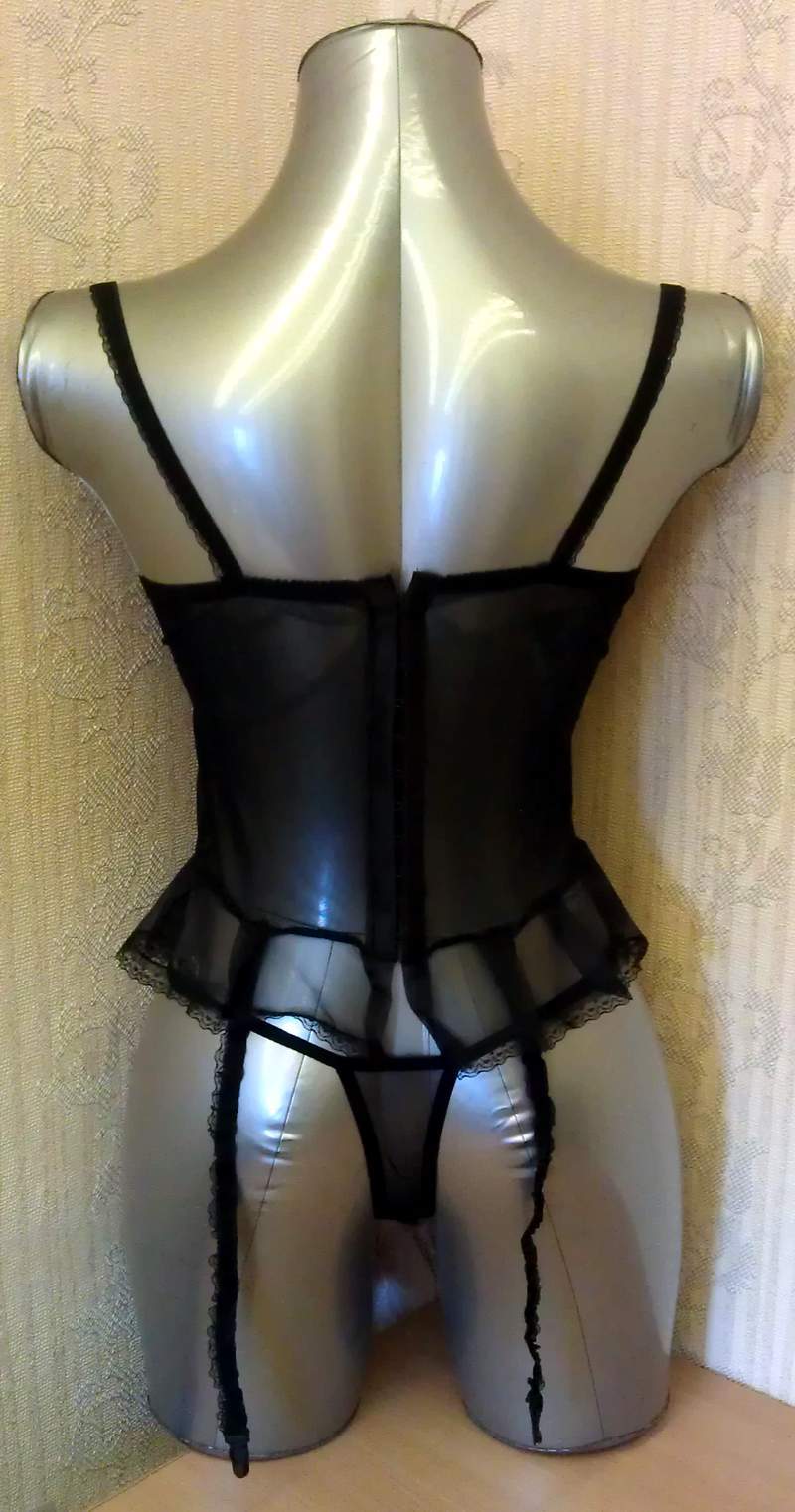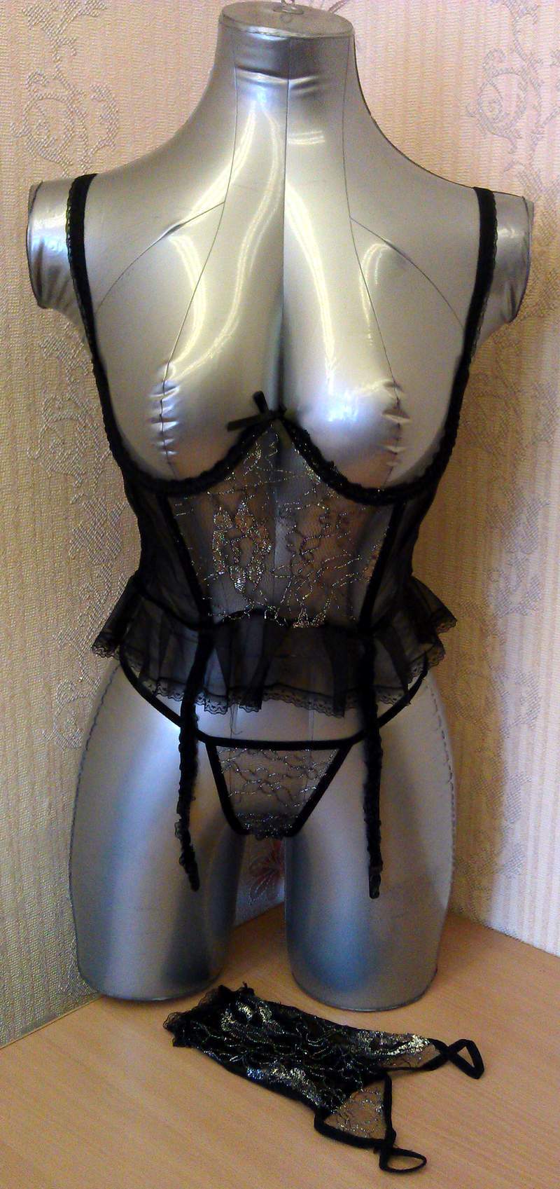 Сексуальный комплект с открытой грудью из полупрозрачного тонкого материала, вышитого серебряной нитью. Топ сзади на застежке - крючочках.