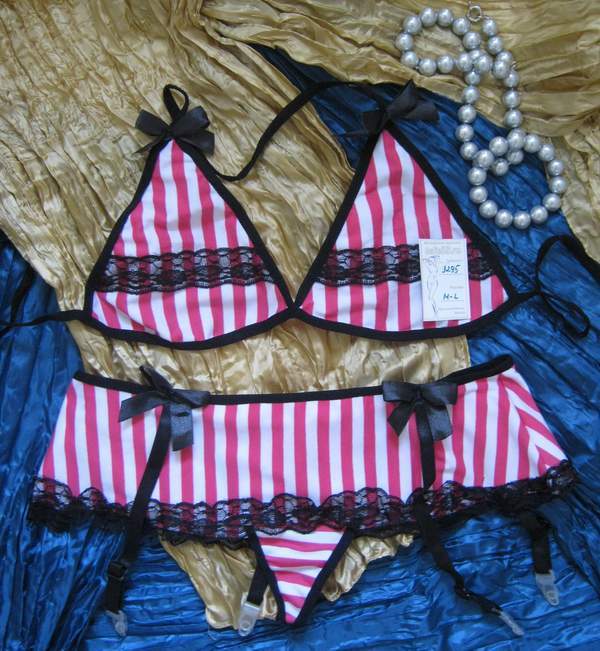 Полосатый комплект, состоящий из топа и пояса-трусиков с подвязками. Украшен кружевом и атласными бантами