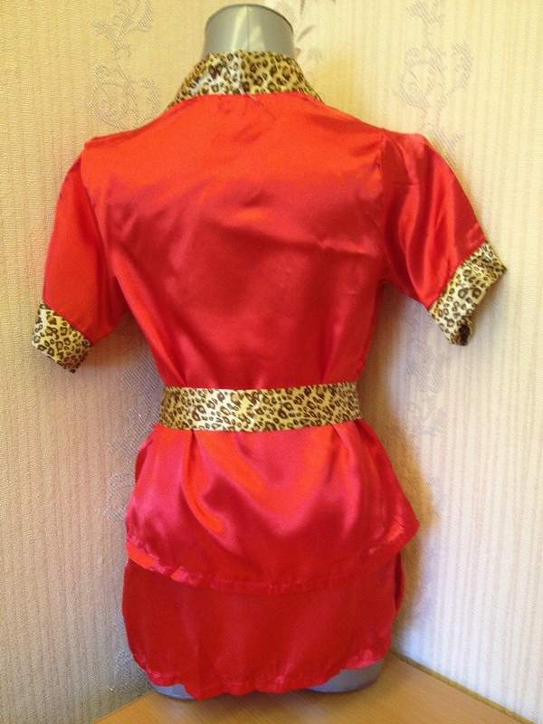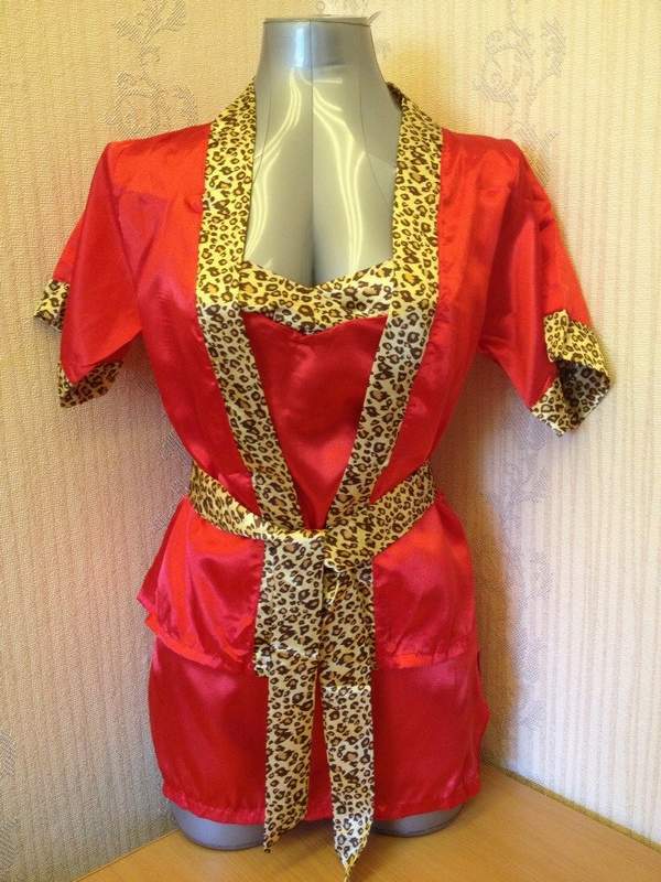 Красный комплект из комбинации и короткого пеньюара из атласного материала с анималистичным принтом.