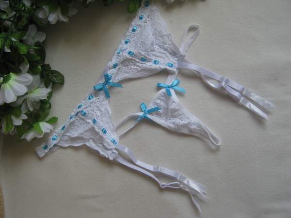 В комплекте трусики-стринги и пояс с подвязками для чулок. Белоснежный цвет в дополнении с голубым придают комплекту очаровательную нежность.