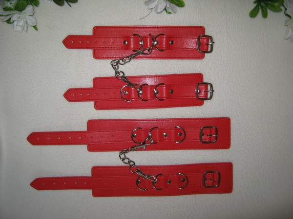 Набор изготовлен из искусственно кожи, с изнаночной стороны выполнен из искусственного меха. Между собой соединены цепочкой. Застежка — ремешок с пряжкой.