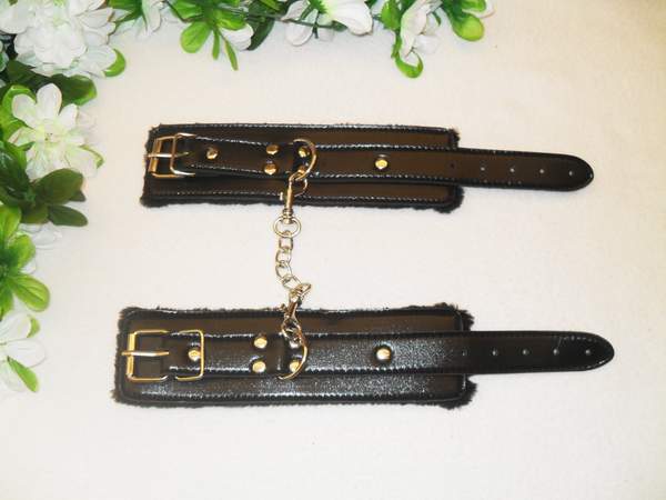 Наручники из искусственной кожи с изнаночной стороны выполнены из искусственного меха, между собой соединены цепочкой. Застежка — ремешок с пряжкой. В комплект входят наручники для рук и оковы для ног