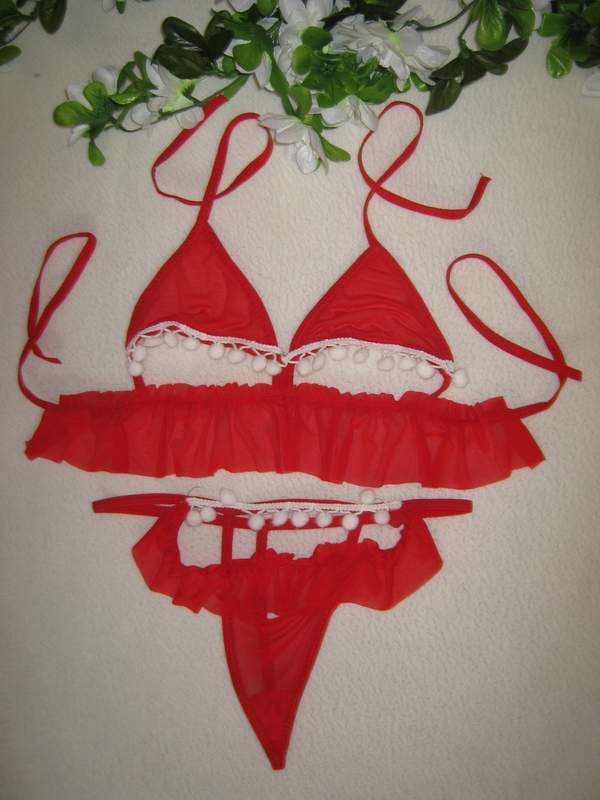 Красный сетчатый комплект украшен рюшами и контрастными пумпончиками.