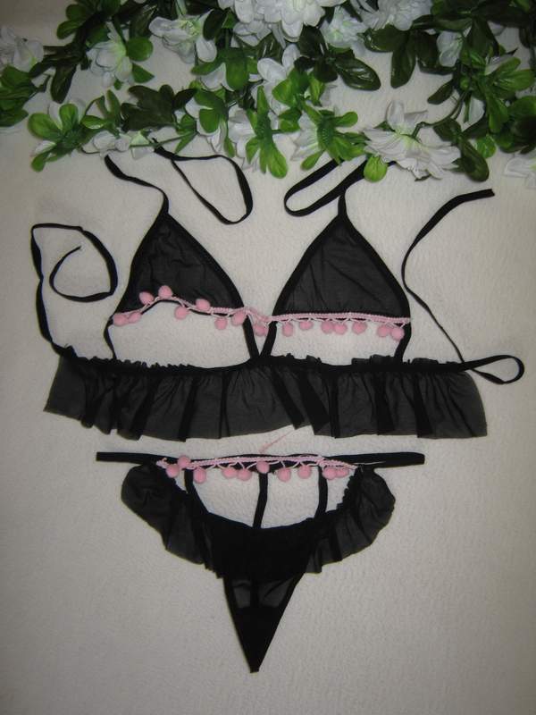 Красный сетчатый комплект украшен рюшами и контрастными пумпончиками.