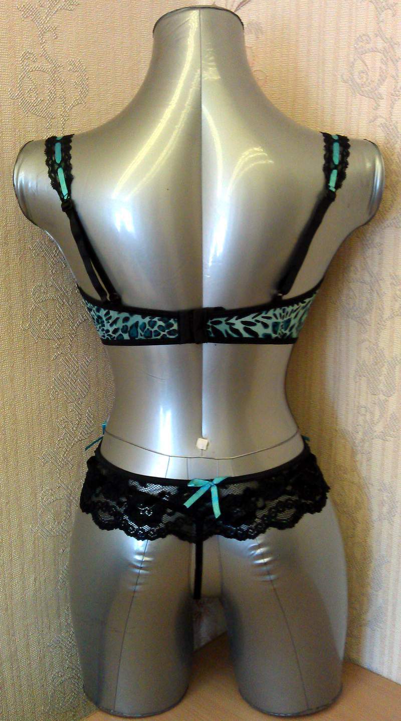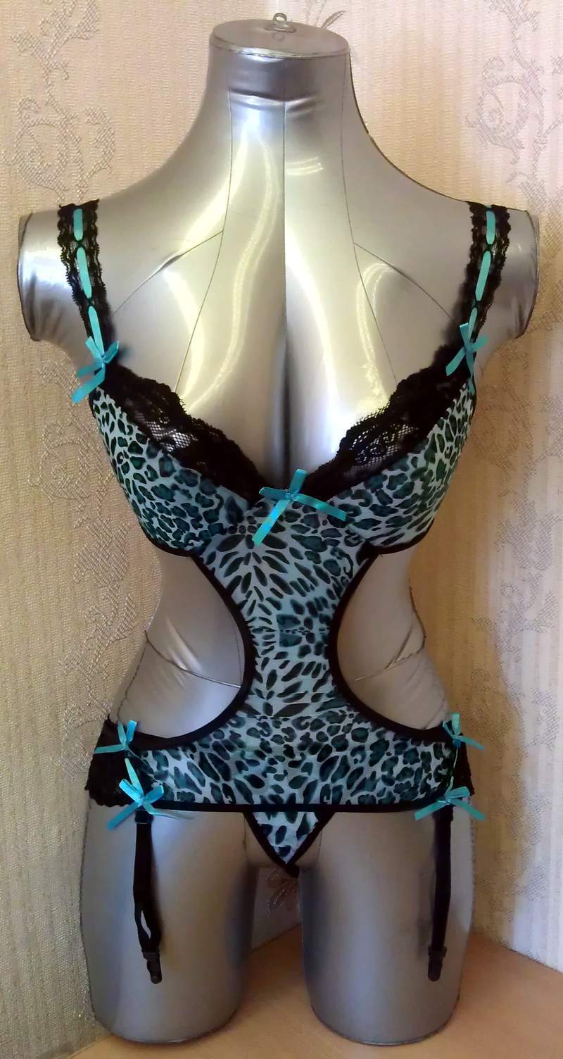 Комплект выполнен из эластичного сетчатого материала, украшен кружевом и лентами.