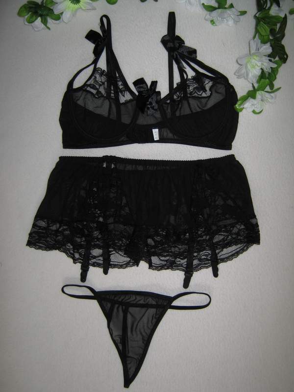 Комплект классического черного цвета из тонкого полупрозрачного материала. Лиф на косточках, юбочка с подвязками для чулок.