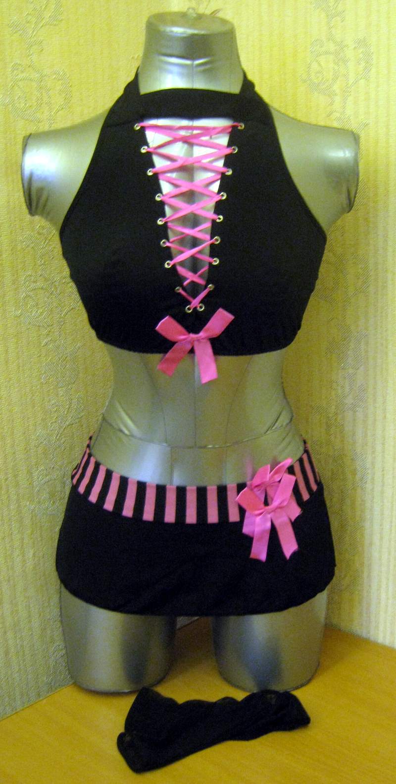 Раздельный комплект из черного эластичного материала, украшенный яркими атласными лентами.