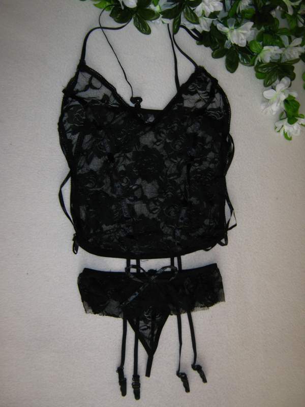 Комплект эротического нижнего белья из кружевного топа и трусиков.
