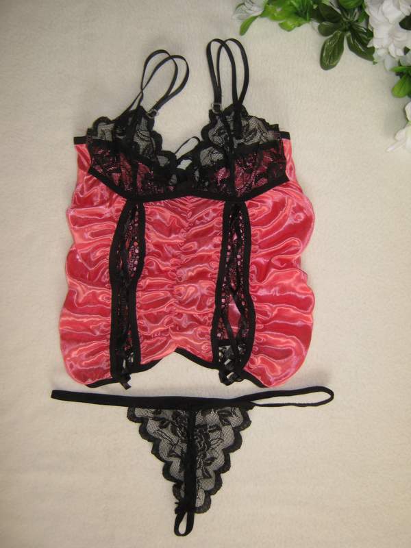 Комплект из сексуального топа с кружевным лифом и трусиков выполнен из атласного материала, украшен кружевом.
