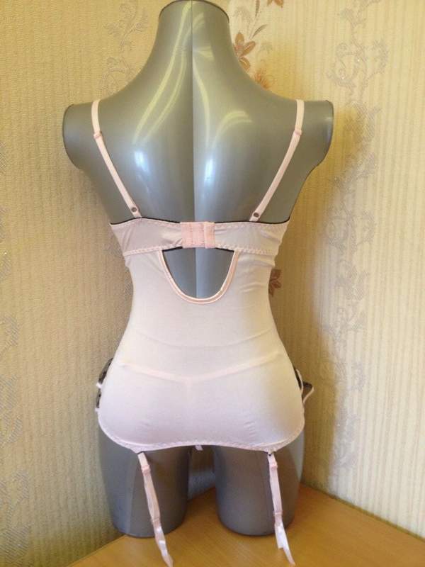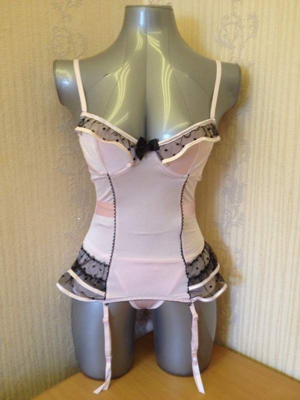 В комплекте удлиненный топ и трусики-стринги нежно-розового цвета. Топ декорирован контрастными рюшами и имеет несъемные подвязки для чулок.