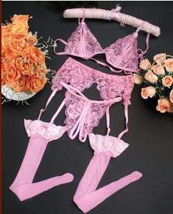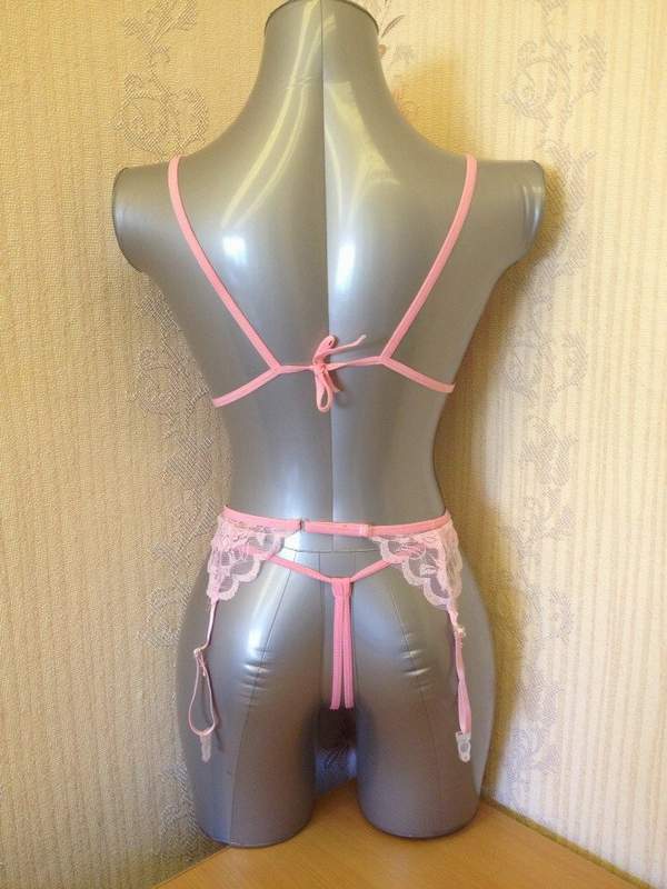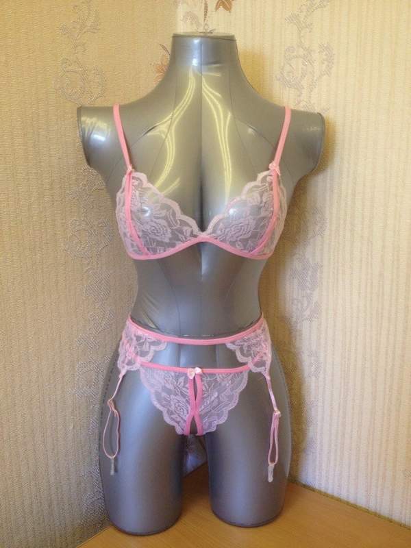 Нежный кружевной комплект из бюстгальтера, трусиков, пояса для чулок и чулок-сетки. Бюстгальтер на завязках, пояс регулируется по ширине (как лямки у бюстгальтеров).