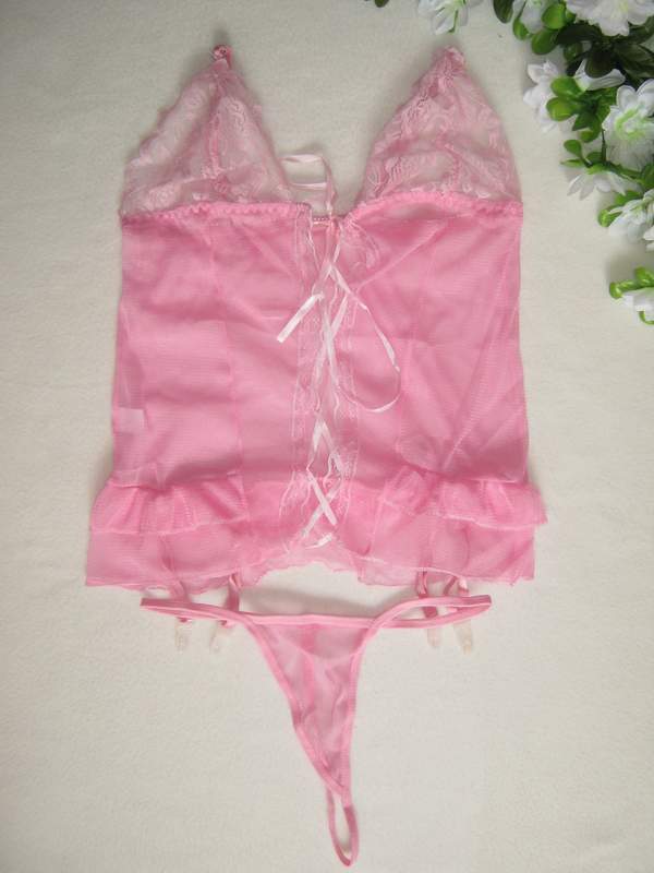 Кружевной комплект из сексуального топа и трусиков соблазнительного розового цвета.
