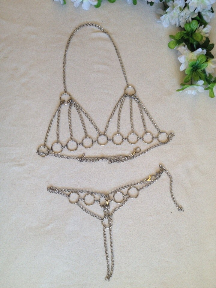 Трусики и лиф выполнены в виде цепочек и металлических колец.