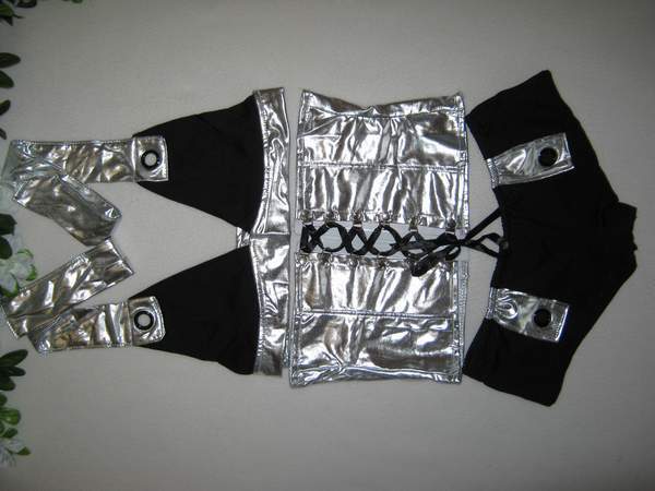 Зажигательный комплект go-go из черного трикотажа со втавками из ткани, имитирующей серебристый винил. Комплект состоит из топа-бюстральтера завязывающегося на шее и на спине, широкого пояса на шнуровке и молнии, шортов.