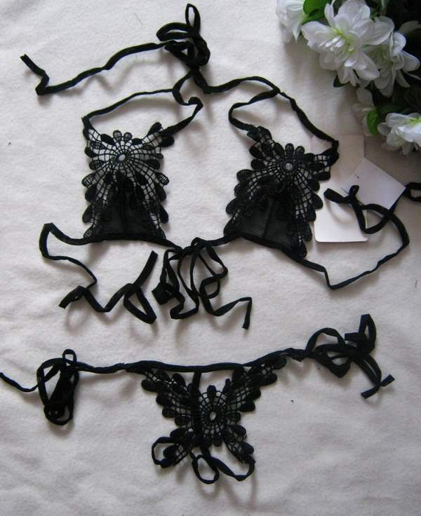 Соблазнительный, максимально открытый комплект украшен вышивкой из плотного кружева. Размер регулируется завязками на шее и спине у лифа и на боках у трусиков.
