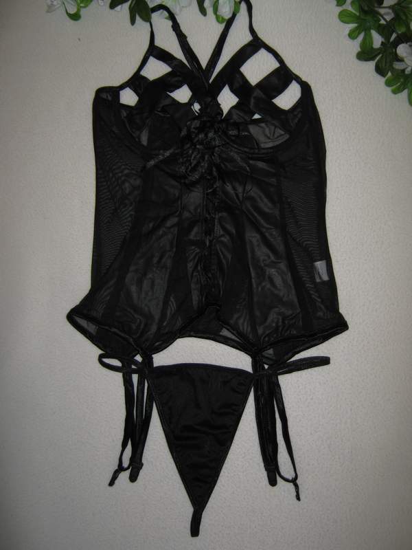 Этот комплект сочетает в себе тонкую полупрозрачную ткань и винил. Топ с открытой грудью декорирован шнуровкой спереди и сзади.