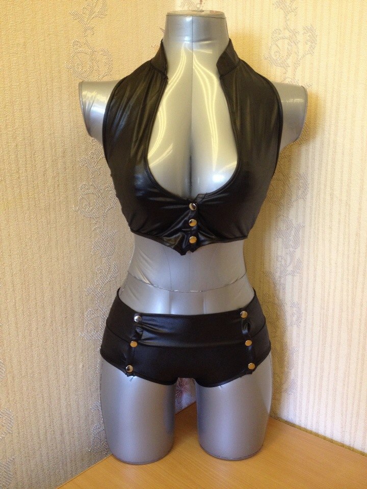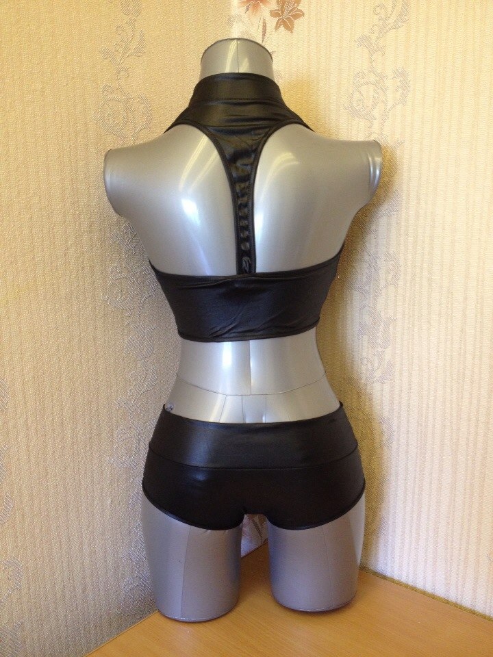 Раздельный комплект включает трусики-шортики и топ с глубоким вырезом. Декор в виде клепок придает дерзость и особую оригинальность.