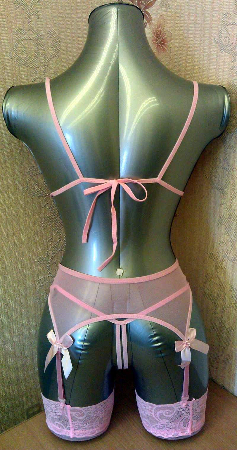 Кружевной комплект включает: трусики-пояс с подвязками для чулок, топ с разрезами, чулки.